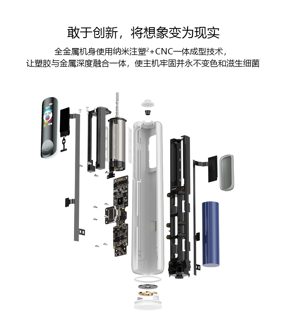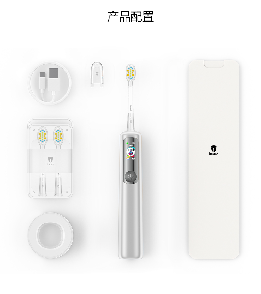 imask 3 电动牙刷附件包含主机1支,用户使用手册1本,充电座1个,刷头2支,数据线1条。